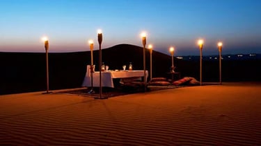 "Dinner on the Dunes" in Jaisalmer typically refers to a dining experience set amidst the sand dunes of the Thar Desert, often including a camel safari, cultural performances, and a bonfire.